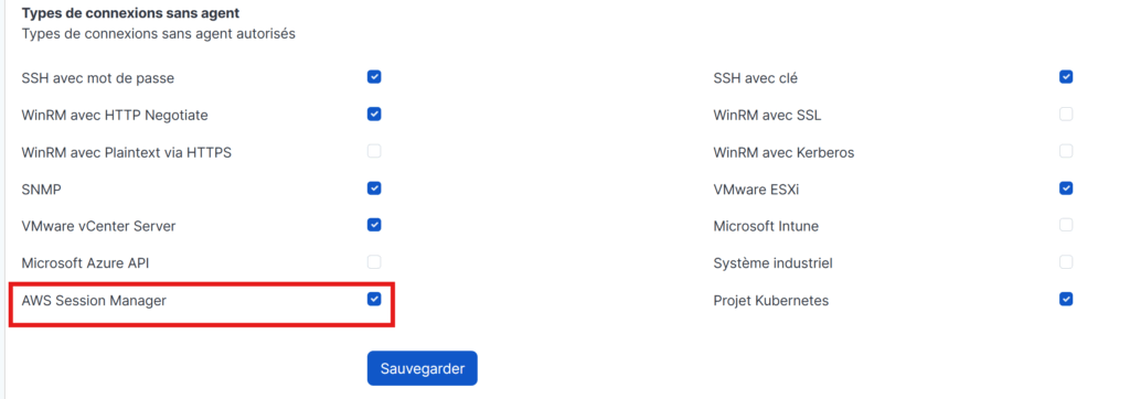 Par défaut, le connecteur AWS Session Manager est désactivé. Pour l’activer : rendez-vous dans « Administration → Gestion des connecteurs » et activez « AWS Session Manager » dans « Types de connexions sans agent » :