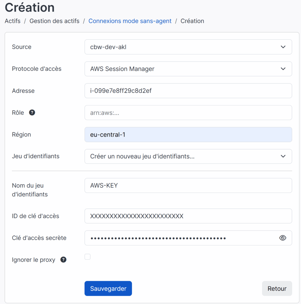 - Remplissez les champs requis (nom, identifiants AWS, etc.).