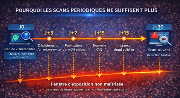 Imaginez un cycle de scan mensuel qui s’exécute le 1er du mois. Le 3, votre équipe DevOps déploie un microservice avec une dépendance vulnérable. Le 7, une CVE critique est publiée sur un composant présent dans 30% de votre infrastructure. Le 15, un stagiaire lance une instance EC2 pour tester un POC et oublie de la désactiver.