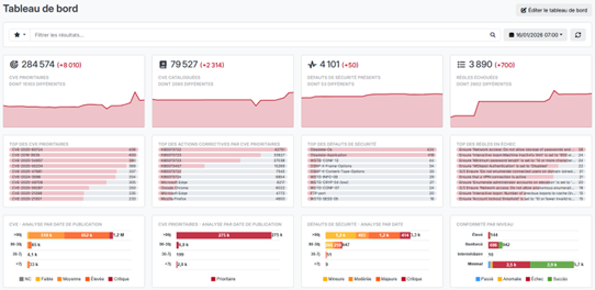 Ces données alimentent les tableaux de bord : vulnérabilités critiques par périmètre, temps moyen de remédiation, respect des SLA, couverture des scans.