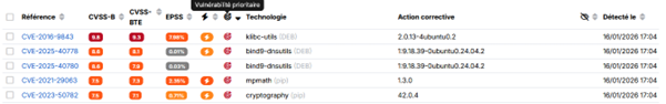 Croisée avec le score EPSS et l’appartenance à des catalogues de référence (CERT-FR, CISA KEV…), cette information permet d’identifier immédiatement les vulnérabilités activement exploitées, faciles à industrialiser dans des campagnes d’attaque, et reconnues comme critiques par les autorités de référence.