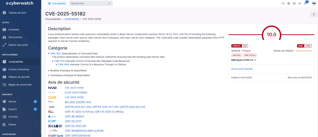 Utilisez notre produit pour identifier efficacement la présence des vulnérabilités CVE-2025-55182 et CVE-2025-66478, et déployer vos actions correctives au plus vite. Pour toute question concernant ces détections, contactez notre équipe sur support@cyberwatch.com ou demandez une démonstration via le formulaire dédié.