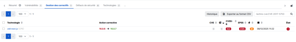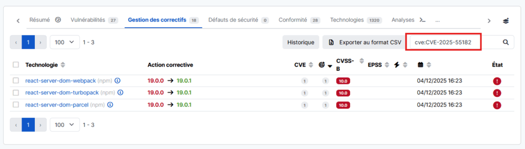 En analysant les informations issues des deux CVE liées à react2shell et en les croisant avec des sources fiables comme GitHub, Cyberwatch vous proposera une détection optimisée et un patch adapté aux technologies détectées sur vos actifs.