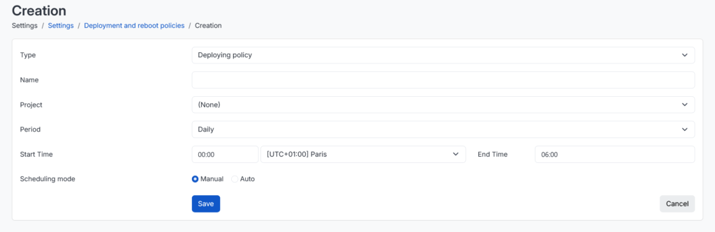 To create a deployment policy, go to the “Settings” menu in Cyberwatch, then to “Deployment and Restart Policies”: