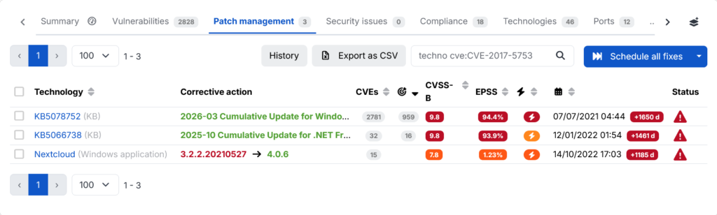 This simplifies vulnerability management: vulnerability fixes on Windows and Linux are automated on these assets, reducing remediation time and the number of priority vulnerabilities to be fixed on your information system. This allows you to make the best use of your teams’ time on other tasks, such as monitoring the most critical assets.