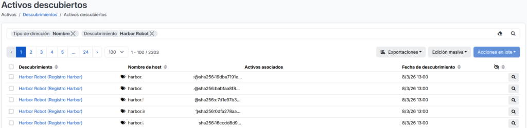 Una vez finalizada la exploración, si se ha activado la opción de registro automático, las imágenes detectadas se añadirán directamente a Cyberwatch, donde se analizarán para identificar posibles vulnerabilidades. De este modo, Cyberwatch puede realizar este descubrimiento periódicamente, lo que garantiza que el inventario se mantenga conforme al estado real del registro y que se detecten las vulnerabilidades presentes.