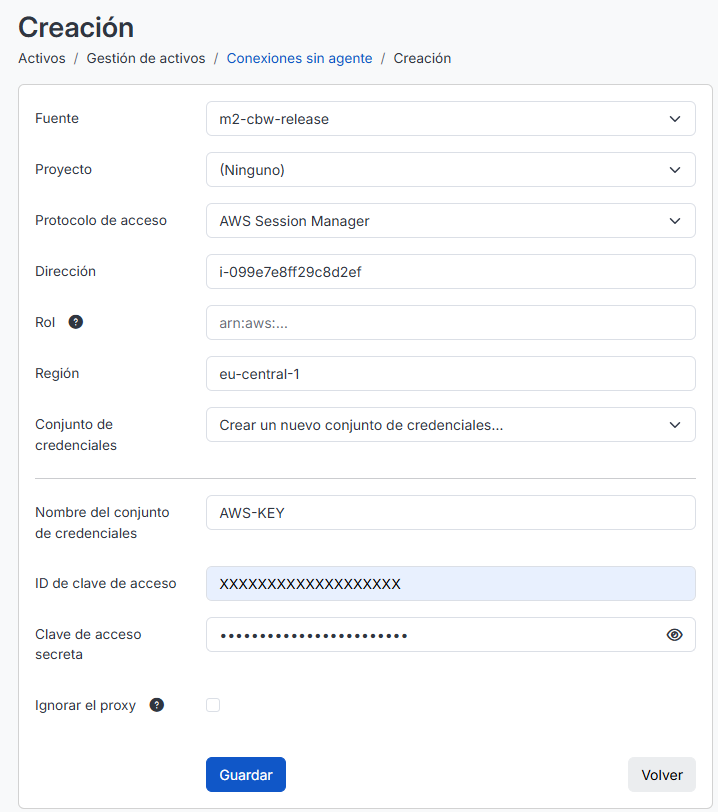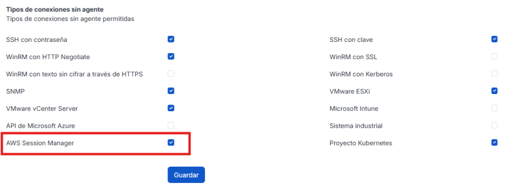 Por defecto, el conector AWS Session Manager está desactivado. Para activarlo: vaya a «Administración Gestión de conectores» y active «AWS Session Manager» en «Tipos de conexiones sin agente»: